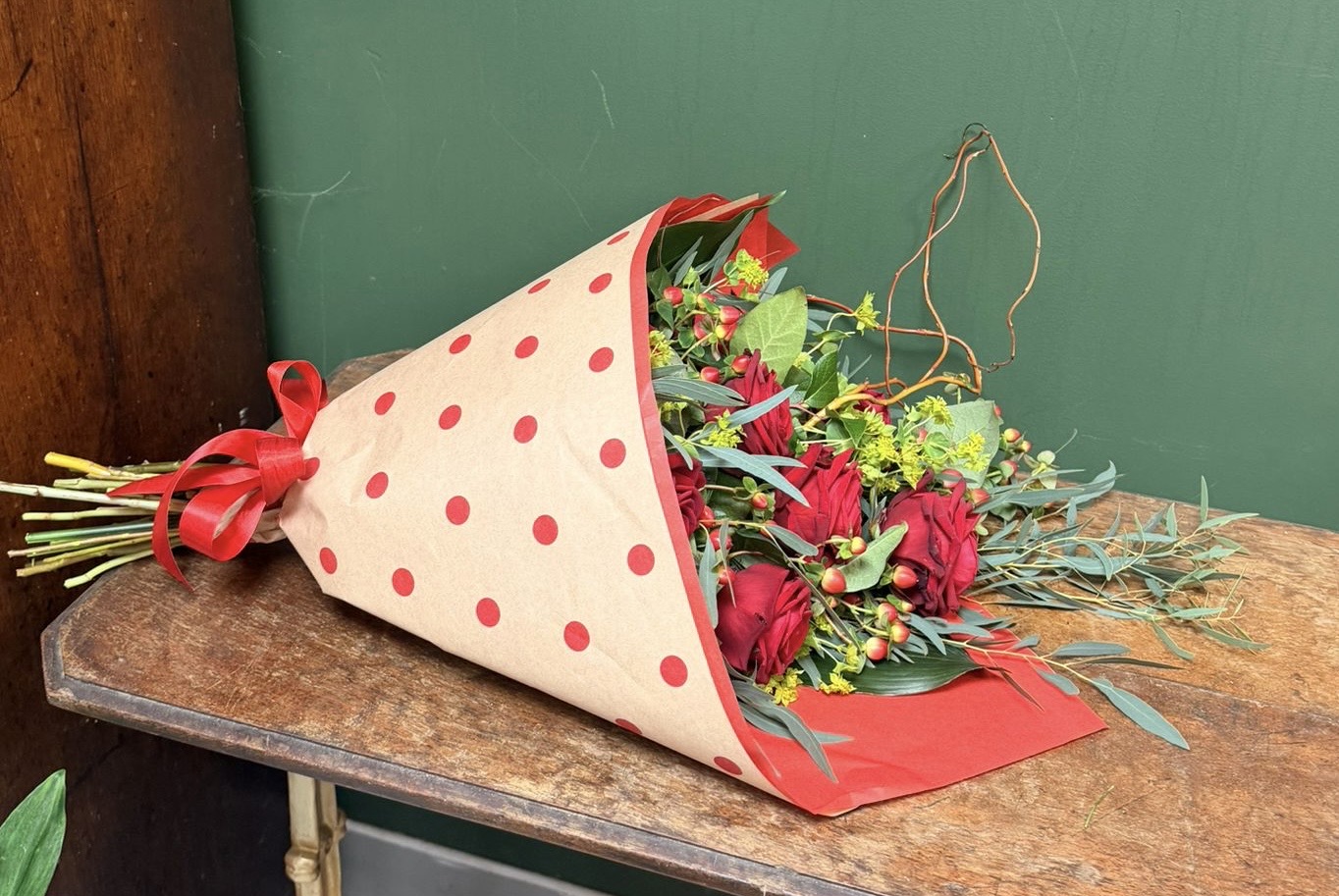 A bouquet of stunning red roses with complementing foliage, a true classic