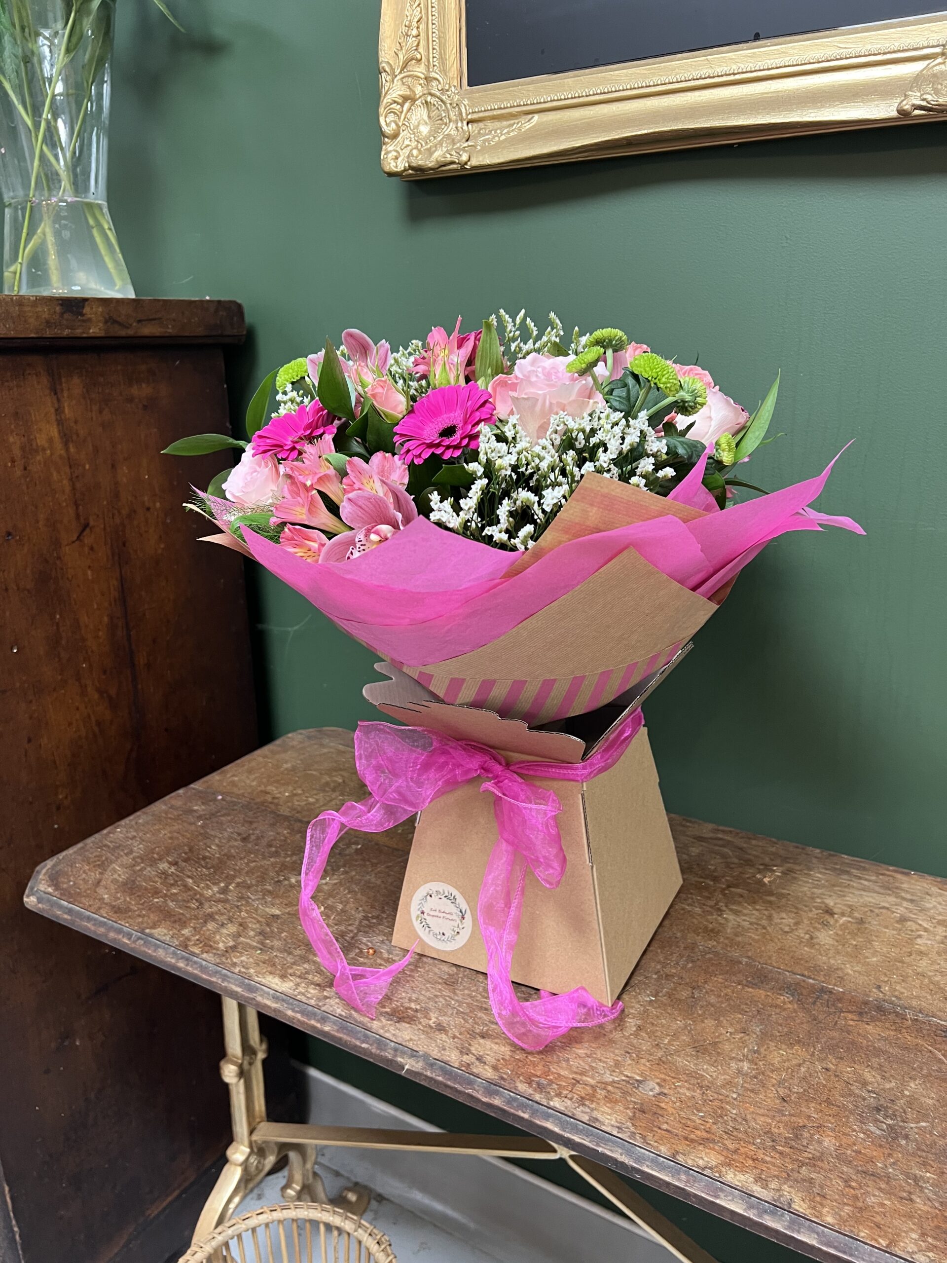 A stunning handtied bouquet of beautiful pink roses combined with complementary flowers and foliage, this bouquet will certainly show that special person how much you care.