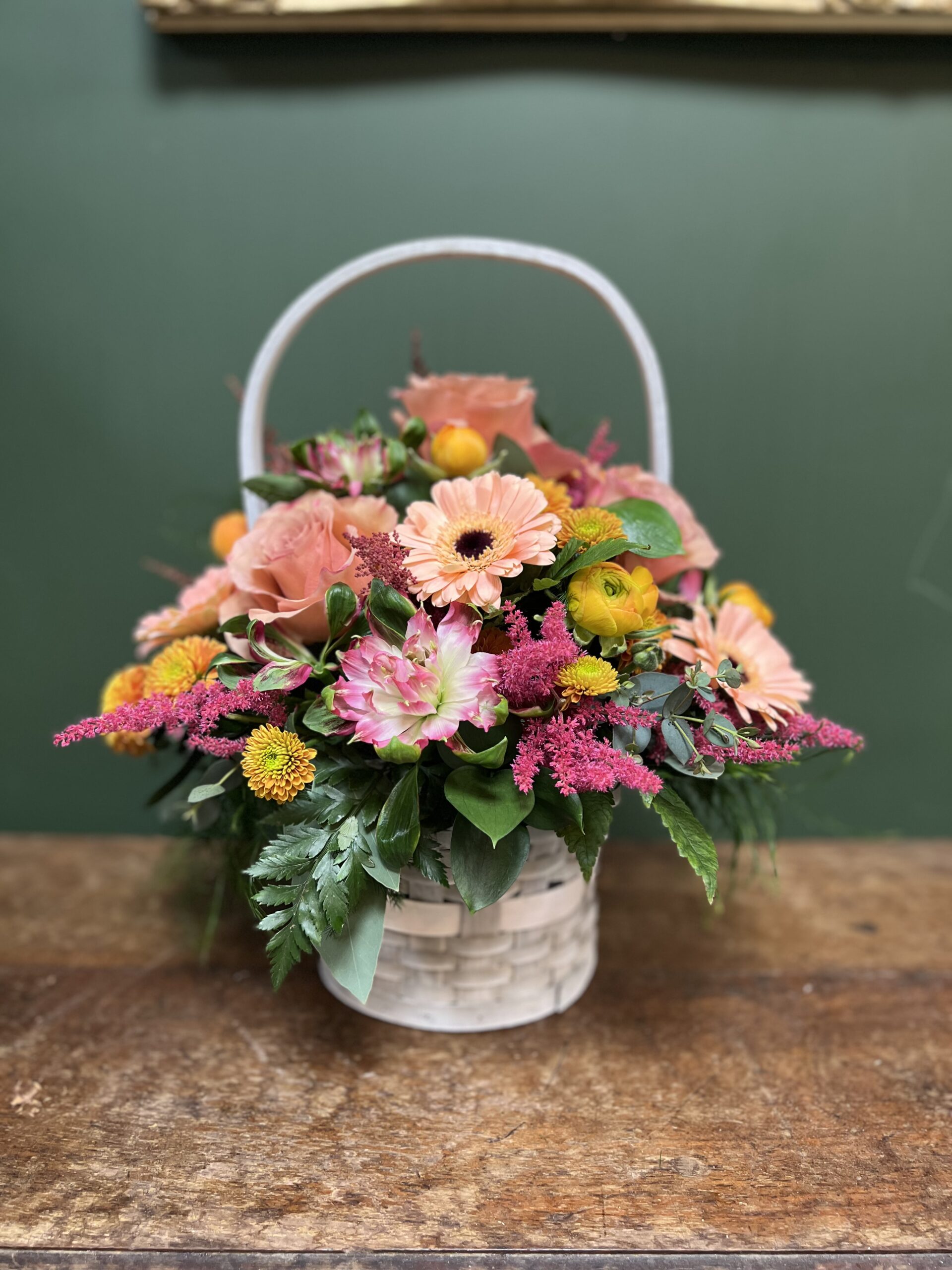 A basket filled with the seasons best flowers combined with complementary and foliage, a lovely gift for Mum